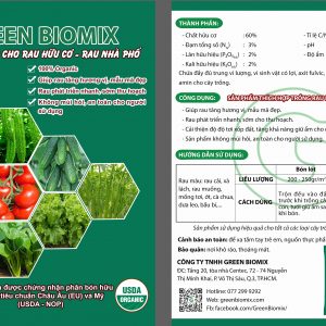 Phân hữu cơ Green Biomix 100% Organic được sản xuất theo quy trình công nghệ lên men vi sinh vật & các enzyme sinh học. Viên phân hữu cơ Green Biomix được phân hủy kỹ, khi rã không có xác thô, không có mùi hôi. Sản phẩm phù hợp cho trồng rau hữu cơ, rau nhà phố, nhà kính,…